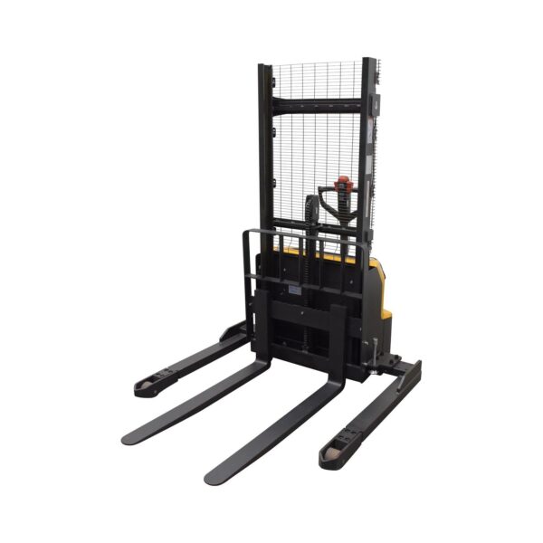 Steel/Plastic Hand Pump DC Powered Stacker with Adjustable Forks and Legs 98 In. Raised Height 2,000 Lb. Capacity Black/Yellow